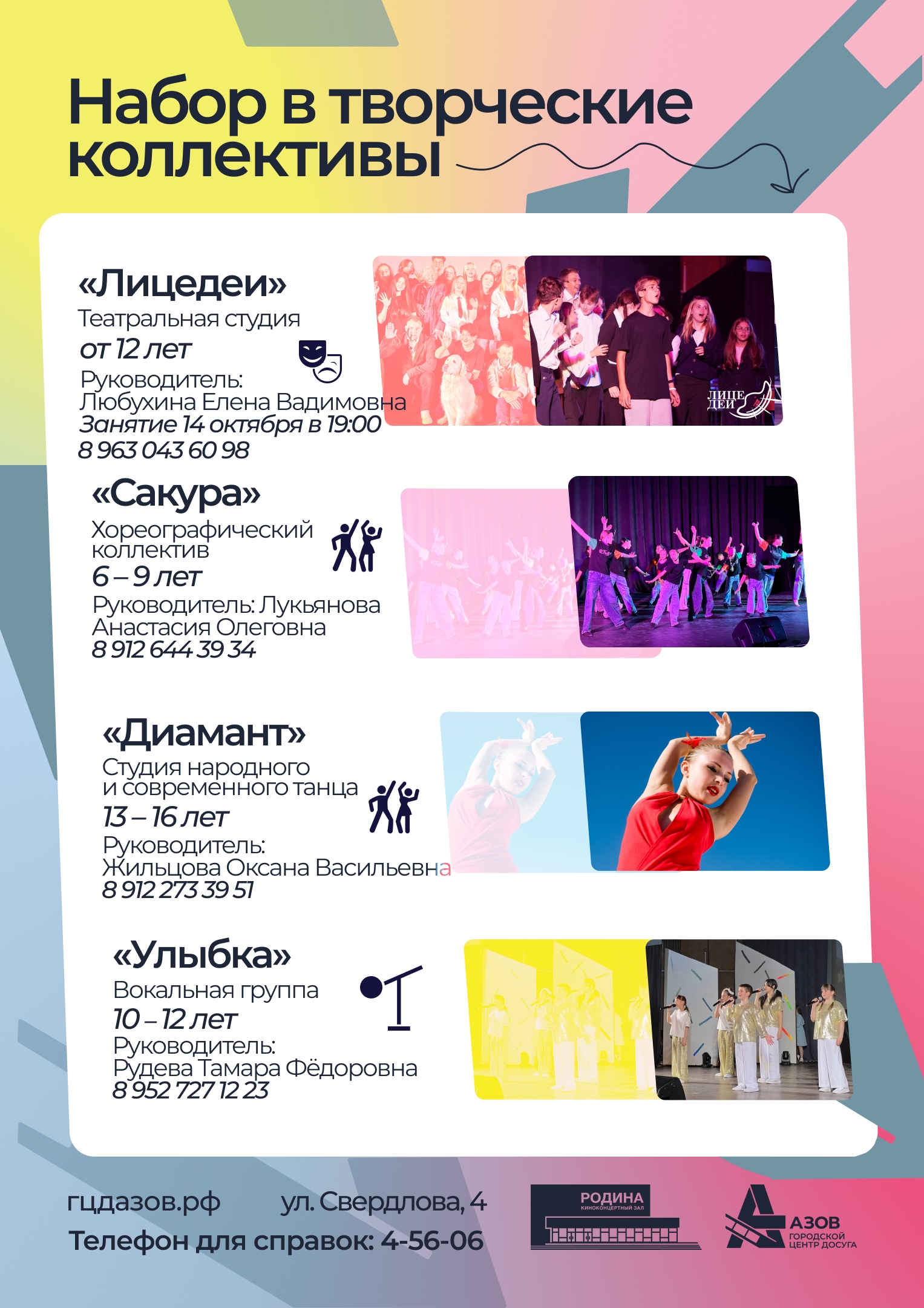 ГОРОДСКОЙ ЦЕНТР ДОСУГА «АЗОВ» объявляет набор детей и взрослых в творческие коллективы! Сезон 2025 – 2026 год!
